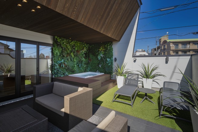 テラスにジャグジーを備えたリゾートライクな住まい。