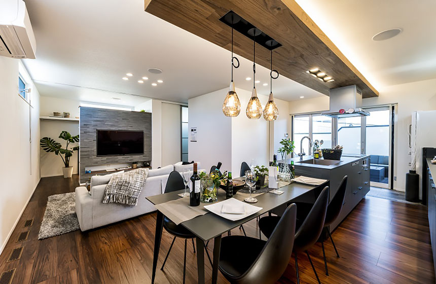 リビング階段・和室などのこだわりの詰まった家一番過ごす時間が長いLDKを広く取り、家族が集まりやすく、それぞれが窮屈に感じる事がなく、伸び伸び暮らせる住まい。